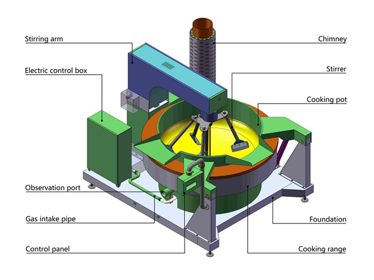 1. High-quality materials. Inner pot is made of stainless steel 304, and it has good thermal conductivity. 2. Unique mixing design. Planetary motions and rotations of food grade PTFE stirrers ensure that there is no dead corner inside the pot. 3. Overturing of stirrers and inner pot is controlled by hydraulic system. 4. Instant electronic temperature measurement is adopted, which could control product quality easily and exactly. 5. The new silent energy-saving furnace heads are used, and it could burn gas fully to save cost. 6. Automatic PLC program could be customized according to customers' requirements. PLC is helpful to realize intelligent factory production line. |